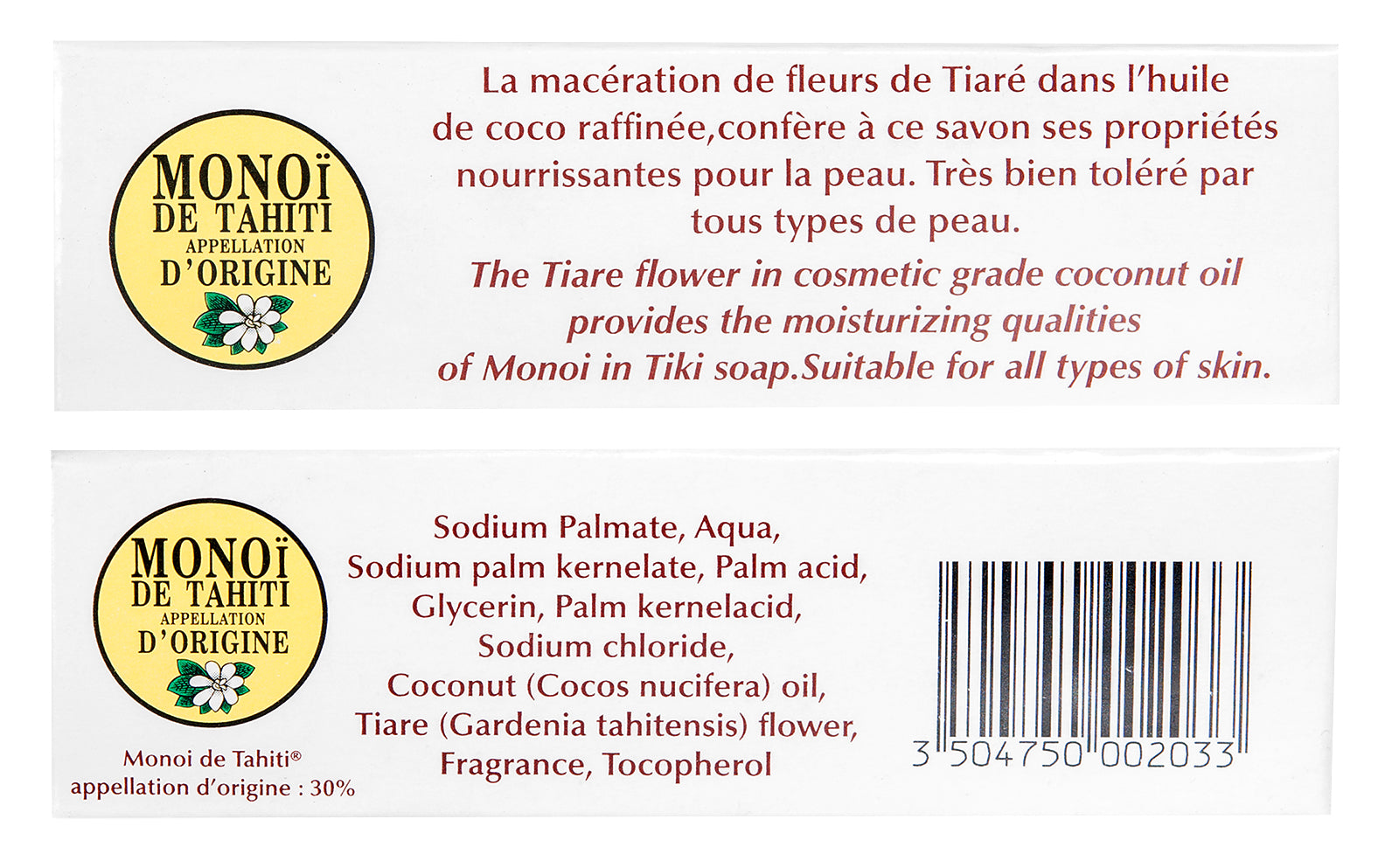 - Matière: 2% Monoï de Tahiti Appellation of Origin ECOCERT COSMOS. Sodium palmate, sodium palm kernelate, palm acid, palm kernel acid, aqua, glycerin, sodium chloride, Parfum, Cocos nucifera oil, gardenia tahitensis flower, tocopherol.