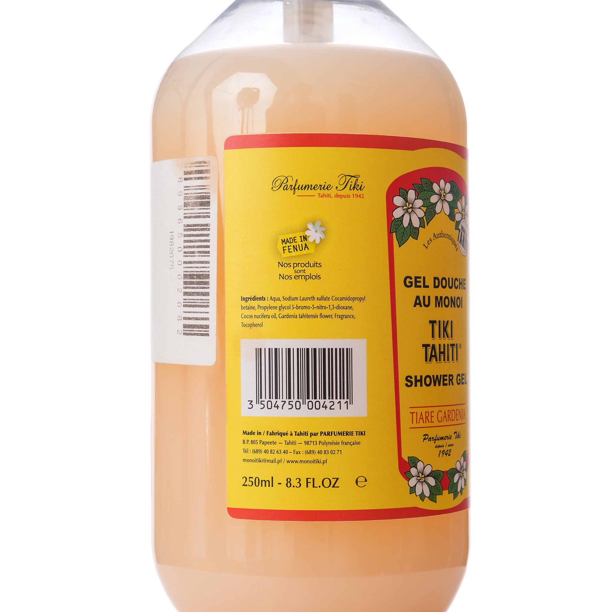 - Matière: 0.5% Monoï de Tahiti Appellation of Origin (AO). Aqua, Sodium laureth sulfate, Cocamidopropyl betaine, Propylene glycol 5-bromo-5-nitro-1,3-dioxane, Cocos nucifera oil, Gardenia taitensis flower extract, Parfum (Fragrance), Tocopherol (Vitamin E), Amyl ci